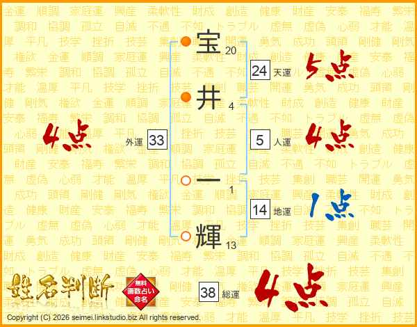 生活面を象徴する運勢です。外部から受ける影響力を表し、結婚運、家庭運や職場、環境への順応性を表します。総運から人運を引いた画数。姓や名が1文字の場合を除く。