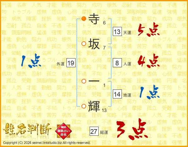 寺(6画)坂(7画) 一(1画)輝(13画)