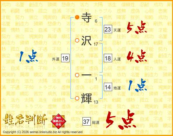 寺(6画)沢(17画) 一(1画)輝(13画)