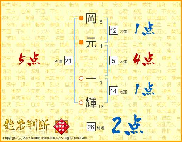 岡(8画)元(4画) 一(1画)輝(13画)