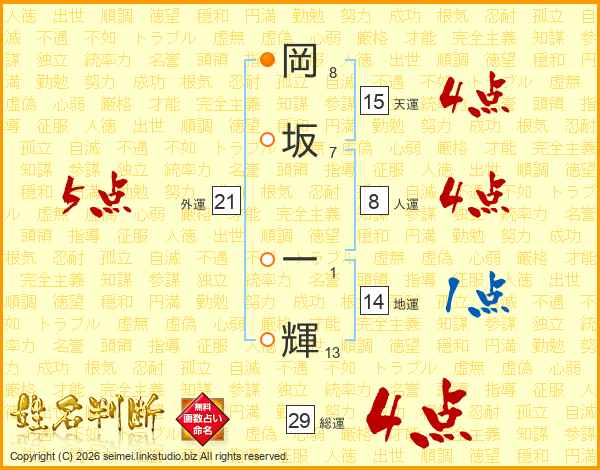 岡坂一輝さんの総運は29画の4点!