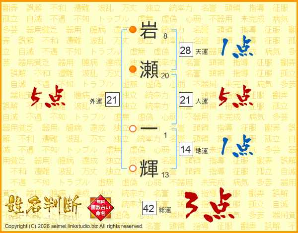 岩(8画)瀬(20画) 一(1画)輝(13画)