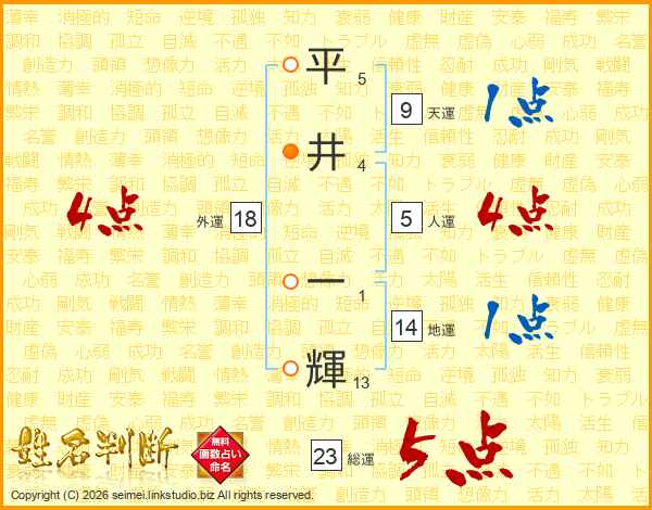 生活面を象徴する運勢です。外部から受ける影響力を表し、結婚運、家庭運や職場、環境への順応性を表します。総運から人運を引いた画数。姓や名が1文字の場合を除く。