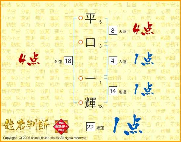 生活面を象徴する運勢です。外部から受ける影響力を表し、結婚運、家庭運や職場、環境への順応性を表します。総運から人運を引いた画数。姓や名が1文字の場合を除く。