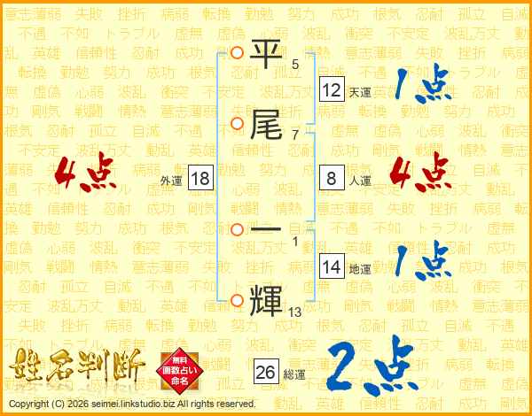 生活面を象徴する運勢です。外部から受ける影響力を表し、結婚運、家庭運や職場、環境への順応性を表します。総運から人運を引いた画数。姓や名が1文字の場合を除く。