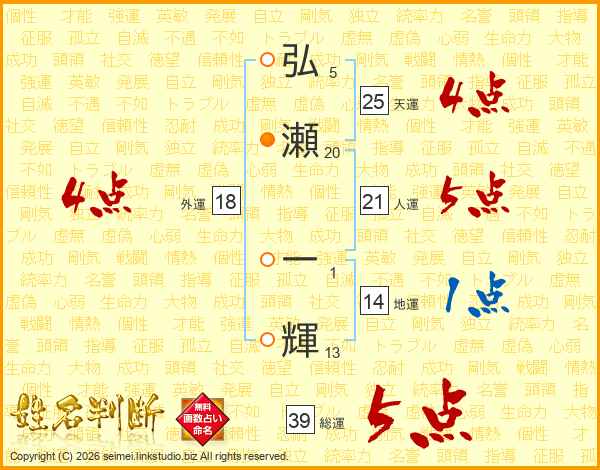 弘瀬一輝さんの総運は39画の5点!
