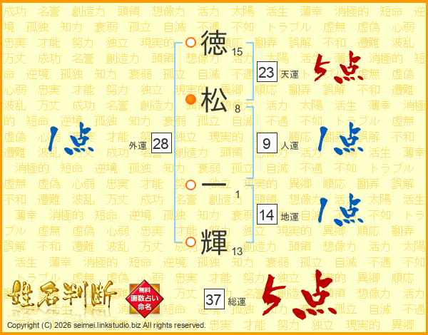 生活面を象徴する運勢です。外部から受ける影響力を表し、結婚運、家庭運や職場、環境への順応性を表します。総運から人運を引いた画数。姓や名が1文字の場合を除く。