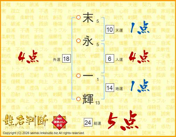 生活面を象徴する運勢です。外部から受ける影響力を表し、結婚運、家庭運や職場、環境への順応性を表します。総運から人運を引いた画数。姓や名が1文字の場合を除く。