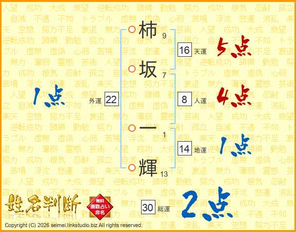 柿(9画)坂(7画) 一(1画)輝(13画)