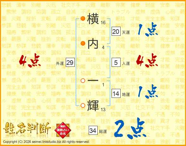 生活面を象徴する運勢です。外部から受ける影響力を表し、結婚運、家庭運や職場、環境への順応性を表します。総運から人運を引いた画数。姓や名が1文字の場合を除く。