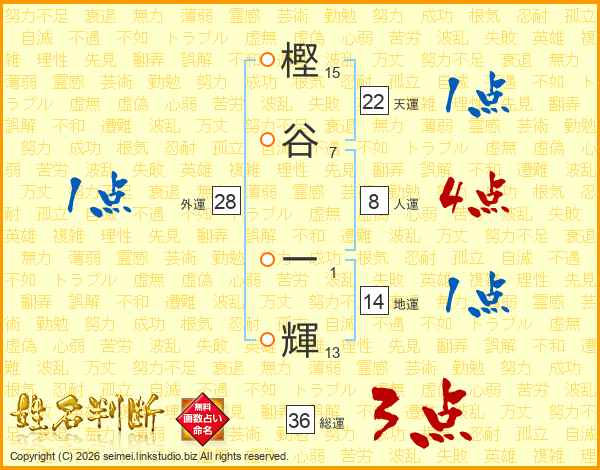 樫谷一輝さんの総運は36画の3点!