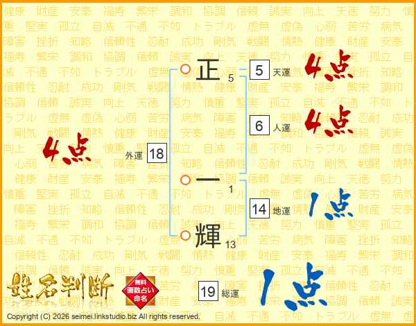 生活面を象徴する運勢です。外部から受ける影響力を表し、結婚運、家庭運や職場、環境への順応性を表します。総運から人運を引いた画数。姓や名が1文字の場合を除く。