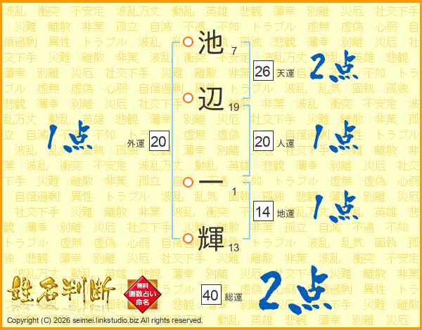 生活面を象徴する運勢です。外部から受ける影響力を表し、結婚運、家庭運や職場、環境への順応性を表します。総運から人運を引いた画数。姓や名が1文字の場合を除く。