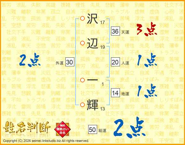 沢(17画)辺(19画) 一(1画)輝(13画)