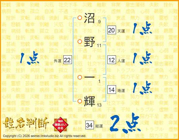 生活面を象徴する運勢です。外部から受ける影響力を表し、結婚運、家庭運や職場、環境への順応性を表します。総運から人運を引いた画数。姓や名が1文字の場合を除く。