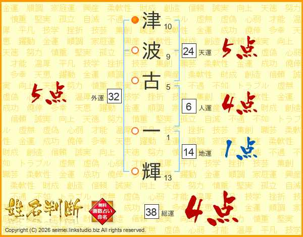 津(10画)波(9画)古(5画) 一(1画)輝(13画)