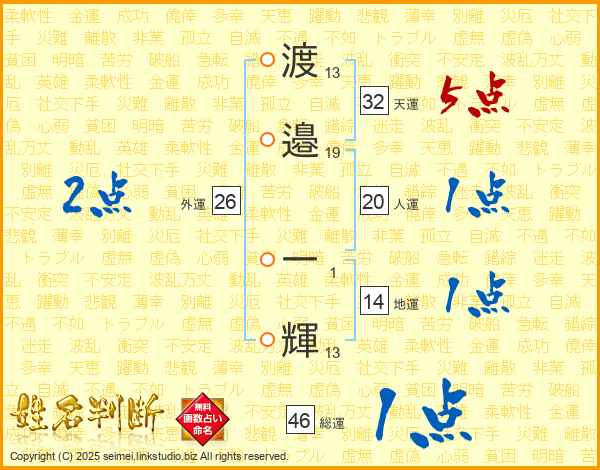 渡(13画)邉(19画) 一(1画)輝(13画)