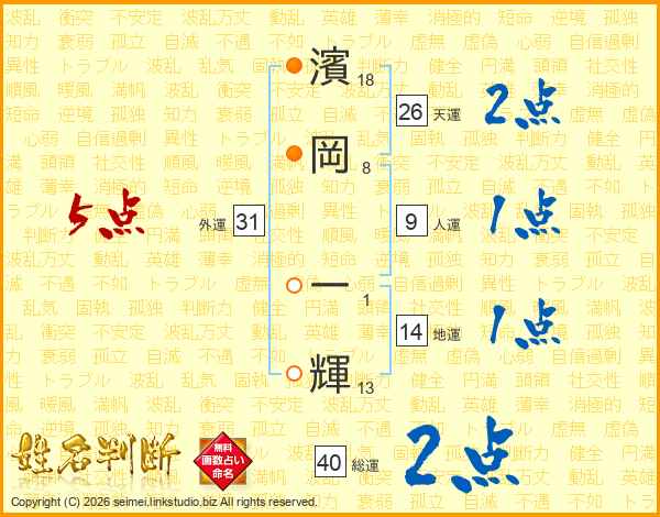 濱(18画)岡(8画) 一(1画)輝(13画)