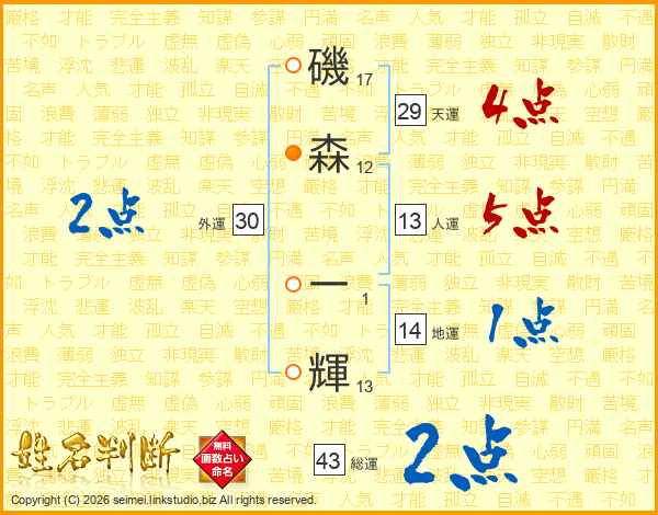 磯森一輝さんの人運は13画の5点!