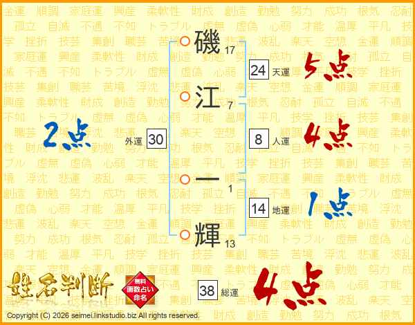 生活面を象徴する運勢です。外部から受ける影響力を表し、結婚運、家庭運や職場、環境への順応性を表します。総運から人運を引いた画数。姓や名が1文字の場合を除く。