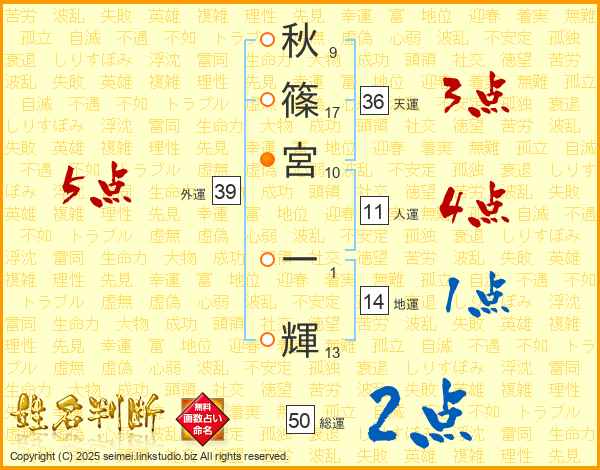 秋(9画)篠(17画)宮(10画) 一(1画)輝(13画)