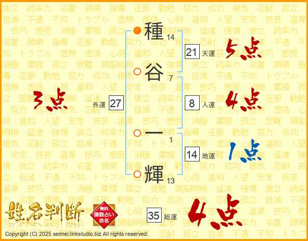 生活面を象徴する運勢です。外部から受ける影響力を表し、結婚運、家庭運や職場、環境への順応性を表します。総運から人運を引いた画数。姓や名が1文字の場合を除く。