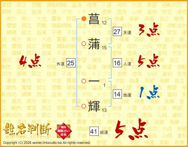 菖(12画)蒲(15画) 一(1画)輝(13画)