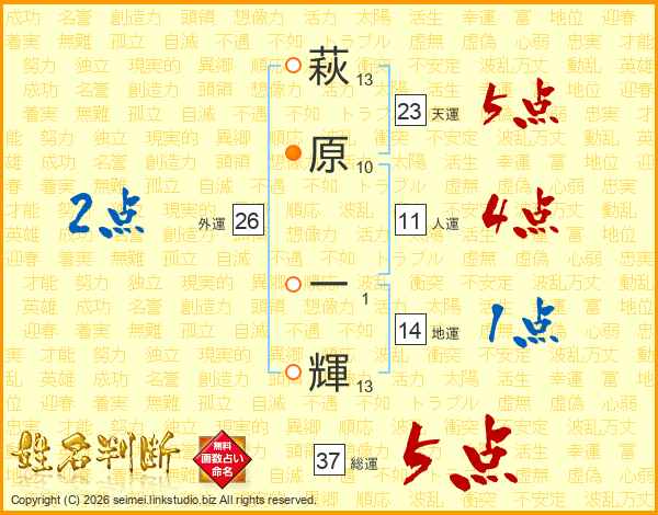 生活面を象徴する運勢です。外部から受ける影響力を表し、結婚運、家庭運や職場、環境への順応性を表します。総運から人運を引いた画数。姓や名が1文字の場合を除く。