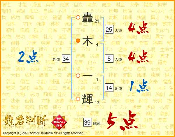 生活面を象徴する運勢です。外部から受ける影響力を表し、結婚運、家庭運や職場、環境への順応性を表します。総運から人運を引いた画数。姓や名が1文字の場合を除く。