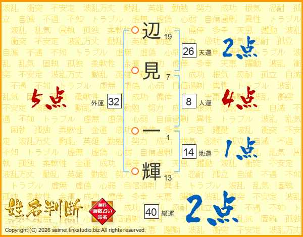 生活面を象徴する運勢です。外部から受ける影響力を表し、結婚運、家庭運や職場、環境への順応性を表します。総運から人運を引いた画数。姓や名が1文字の場合を除く。