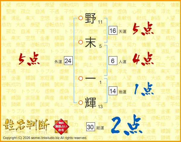 野末一輝さんの総運は30画の2点!