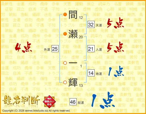 間(12画)瀬(20画) 一(1画)輝(13画)