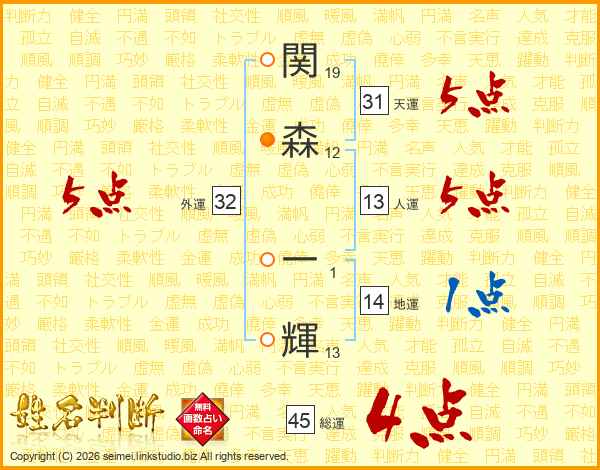 生活面を象徴する運勢です。外部から受ける影響力を表し、結婚運、家庭運や職場、環境への順応性を表します。総運から人運を引いた画数。姓や名が1文字の場合を除く。