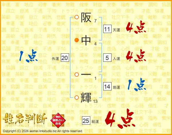 生活面を象徴する運勢です。外部から受ける影響力を表し、結婚運、家庭運や職場、環境への順応性を表します。総運から人運を引いた画数。姓や名が1文字の場合を除く。