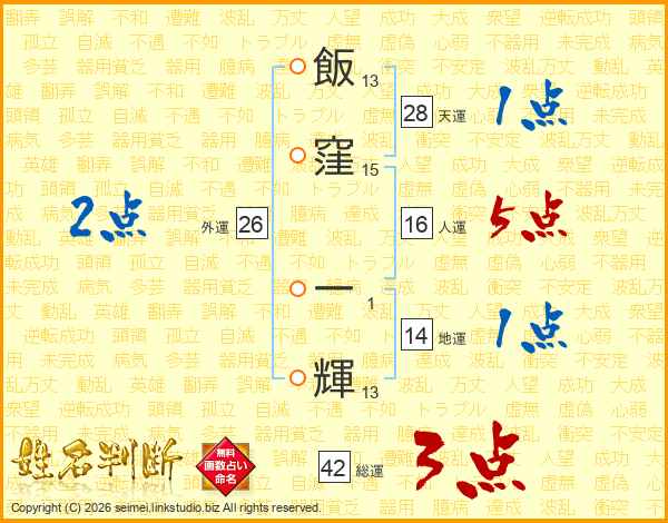 飯(13画)窪(15画) 一(1画)輝(13画)