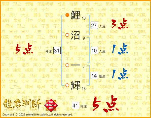 鯉(18画)沼(9画) 一(1画)輝(13画)
