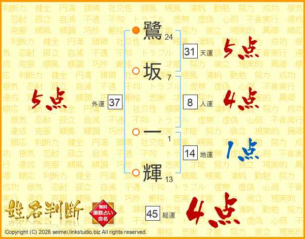 鷺(24画)坂(7画) 一(1画)輝(13画)