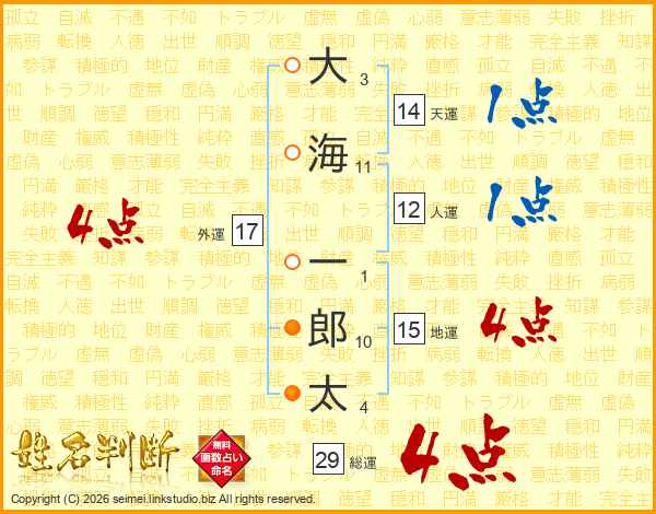 大(3画)海(11画) 一(1画)郎(10画)太(4画)