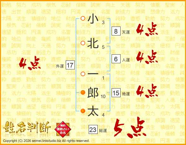 小(3画)北(5画) 一(1画)郎(10画)太(4画)