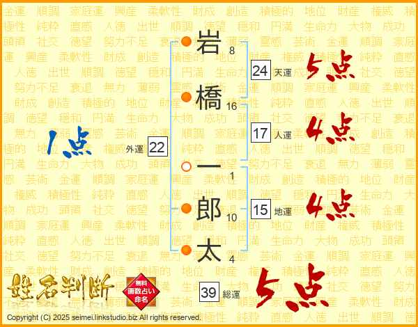 岩(8画)橋(16画) 一(1画)郎(10画)太(4画)