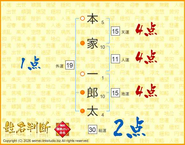 本(5画)家(10画) 一(1画)郎(10画)太(4画)