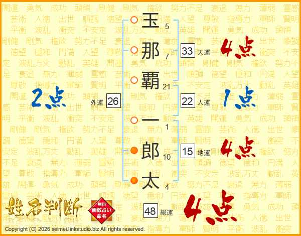 玉(5画)那(7画)覇(21画) 一(1画)郎(10画)太(4画)