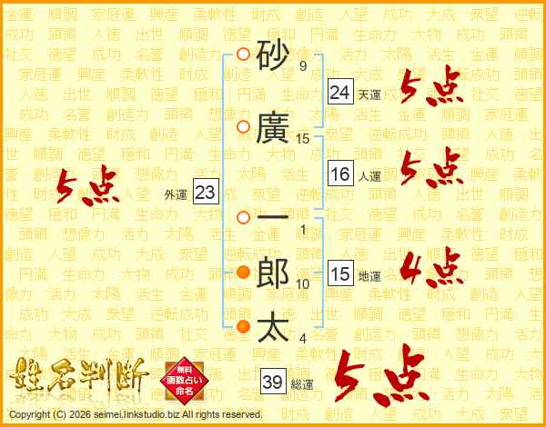 砂(9画)廣(15画) 一(1画)郎(10画)太(4画)