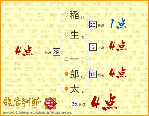 稲(15画)生(5画) 一(1画)郎(10画)太(4画)