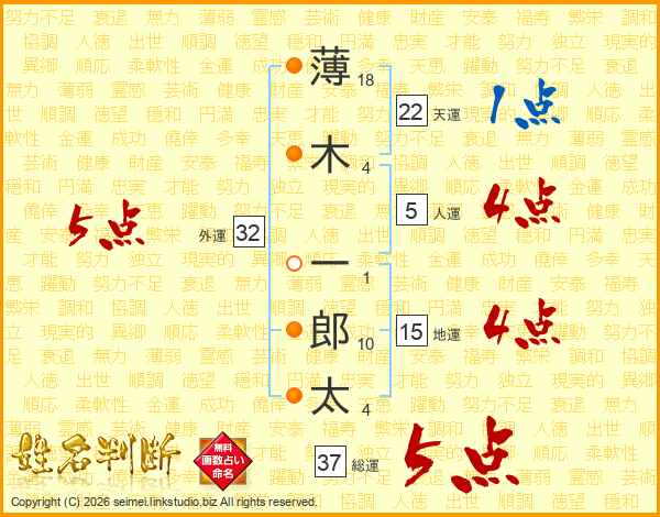 薄(18画)木(4画) 一(1画)郎(10画)太(4画)