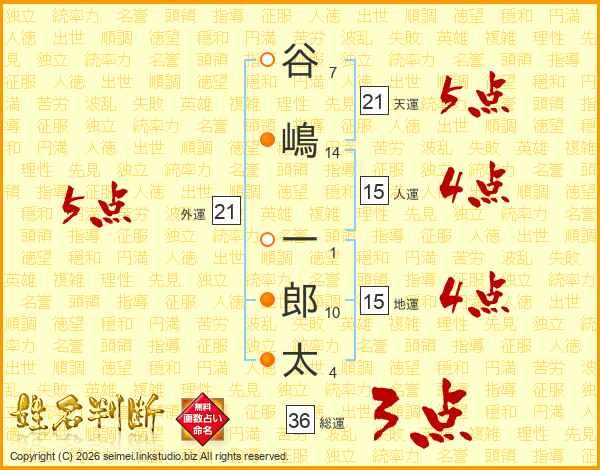 谷(7画)嶋(14画) 一(1画)郎(10画)太(4画)