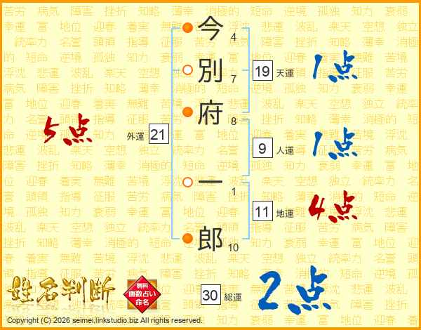 今(4画)別(7画)府(8画) 一(1画)郎(10画)
