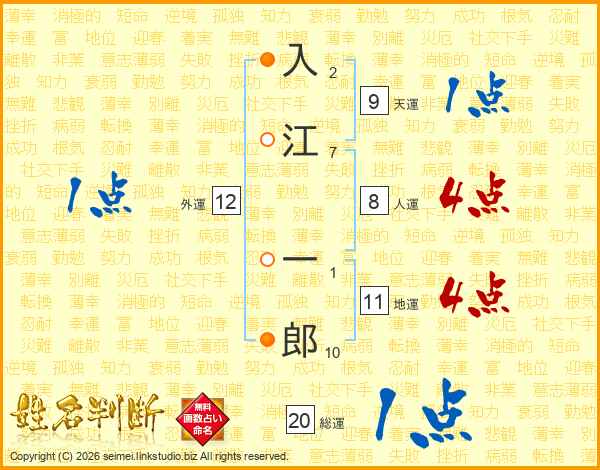 生活面を象徴する運勢です。外部から受ける影響力を表し、結婚運、家庭運や職場、環境への順応性を表します。総運から人運を引いた画数。姓や名が1文字の場合を除く。
