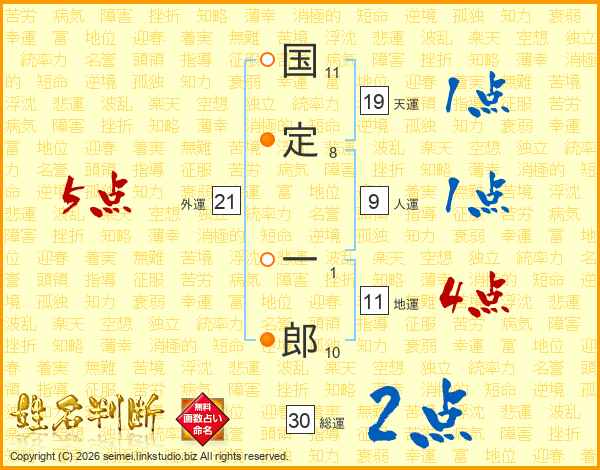 生活面を象徴する運勢です。外部から受ける影響力を表し、結婚運、家庭運や職場、環境への順応性を表します。総運から人運を引いた画数。姓や名が1文字の場合を除く。