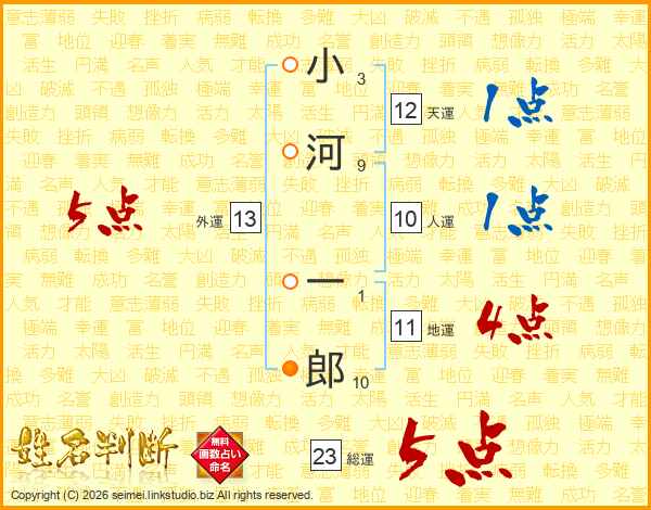 生活面を象徴する運勢です。外部から受ける影響力を表し、結婚運、家庭運や職場、環境への順応性を表します。総運から人運を引いた画数。姓や名が1文字の場合を除く。